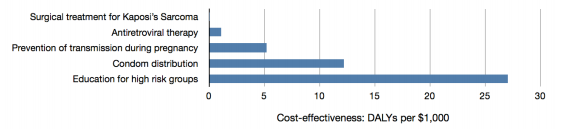 Обратите внимание на широкие расхождения между эффективностью каждого проекта. Лечение саркомы Капоши не обозначено на графике такого масштаба, но это говорит скорее об эффективности других решений, чем об его неблагоприятности: оно полагается экономически выгодным лишь в богатых странах. Считается, что антиретровирусная терапия в 50 раз эффективнее лечения саркомы Капоши; профилактика передачи вируса во время беременности в 5 раз эффективнее терапии; распространение презервативов ещё в два раза эффективнее; и наконец, образование групп высокого риска примерно в два раза эффективнее, чем предыдущее решение. В целом, наилучшая из этих инициатив оценивается как в 1400 раз более экономически выгодная, чем наименее благоприятная, или более чем в 1400 раз лучшая, чем решение, которое получает финансирование в богатых странах.