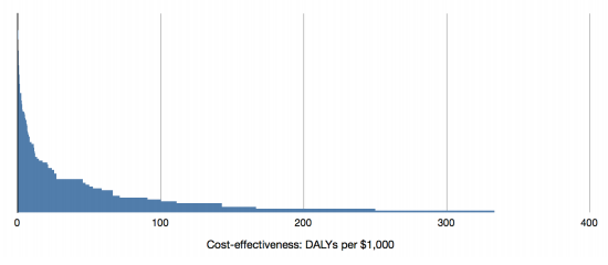 Эта более широкая выборка решений является ещё более разрозненной с точки зрения эффективности распределения средств. Наименее эффективное из проанализированных вмешательств — это по-прежнему лечение саркомы Капоши, но есть также меры, которые в десять раз более экономически эффективны, чем образование групп высокого риска. В целом, все проекты делятся более чем на четыре порядка, варьируясь от 0,02 до 300 DALY за 1000 долларов США, с медианой в 5 DALY. Таким образом, перемещение денег от наименее эффективного до наиболее эффективного медицинского вмешательства принесло бы примерно в 15 000 раз больше пользы, и даже перемещение от медианного вмешательства до наиболее эффективного принесло бы в 60 раз больше пользы.