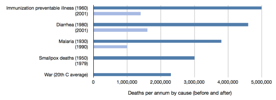 Во всех случаях наше вмешательство привело к тому, что в год умирало по меньшей мере на 2,5 миллиона человек меньше. Чтобы помочь читателю понять масштабы этих достижений, я добавил последнюю строку, демонстрирующую среднее число смертей в год из-за войны и геноцида в течение 20-го века (2,3 миллиона). Таким образом, в сфере каждой из этих четырех болезней наши медико-санитарные инициативы спасают больше жизней, чем было бы сохранено в результате долгосрочного мира во всем мире.